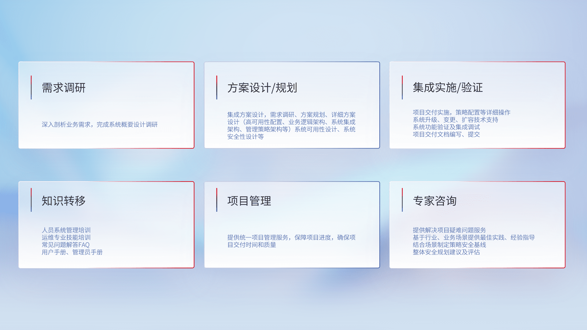 针对客户行业特性,,,,将宏观的安全战略和需求,,,通过专业的交付服务,,,实现项目落地,,,,为客户提供标准规范的集成交付服务。。。。